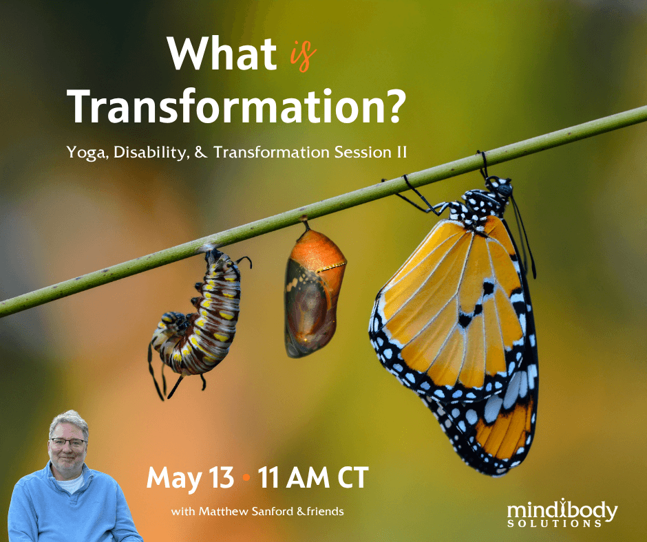 As a non-profit, Mind Body Solutions aims to help transform trauma, loss, and disability into hope and potential. For this year’s three remaining installments of our series, “Yoga, Disability, and Transformation,” we focus in on the process of transformation.Join our founder Matthew Sanford in our May 13th session for an initial, table-setting conversation that explores the overarching theme: what is transformation? What might be some illuminating examples from nature? What is the relationship between transformation and healing? And finally what does it even mean to transform trauma, loss, and disability? As always, there will be a closing yoga practice inspired by our discussion.