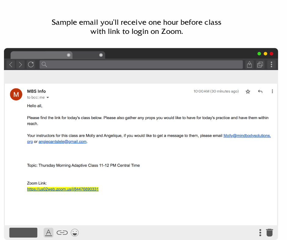 - Each week thereafter, you will receive an email with the Zoom link for each class, approximately one hour prior to class starting time. Click the Zoom Link highlighted in yellow (see below) in that email and you will be directed to the Zoom platform waiting room. The teacher will admit you to the class.