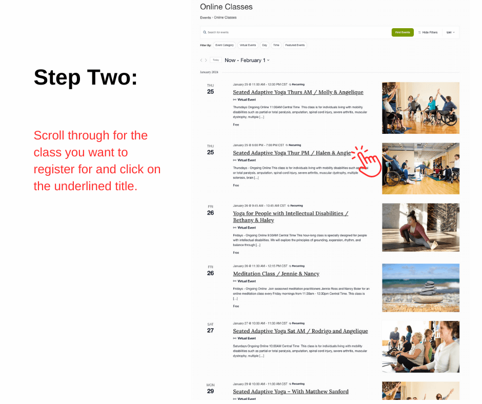 We offer classes six days a week and 24/7 digital access through our website at no cost to the participant. Our live adaptive yoga classes are 100% online and held on the Zoom platform. Classes labeled “Adaptive” are taught from a chair throughout the practice. Classes labeled “Ambulatory” are taught either from a chair or from the floor. Students may attend any class they wish! Our MBS-trained teachers will meet you where you are. Try out a class or two! Meet new friends from around the world and start living better in the body you have. Browse Class Schedule