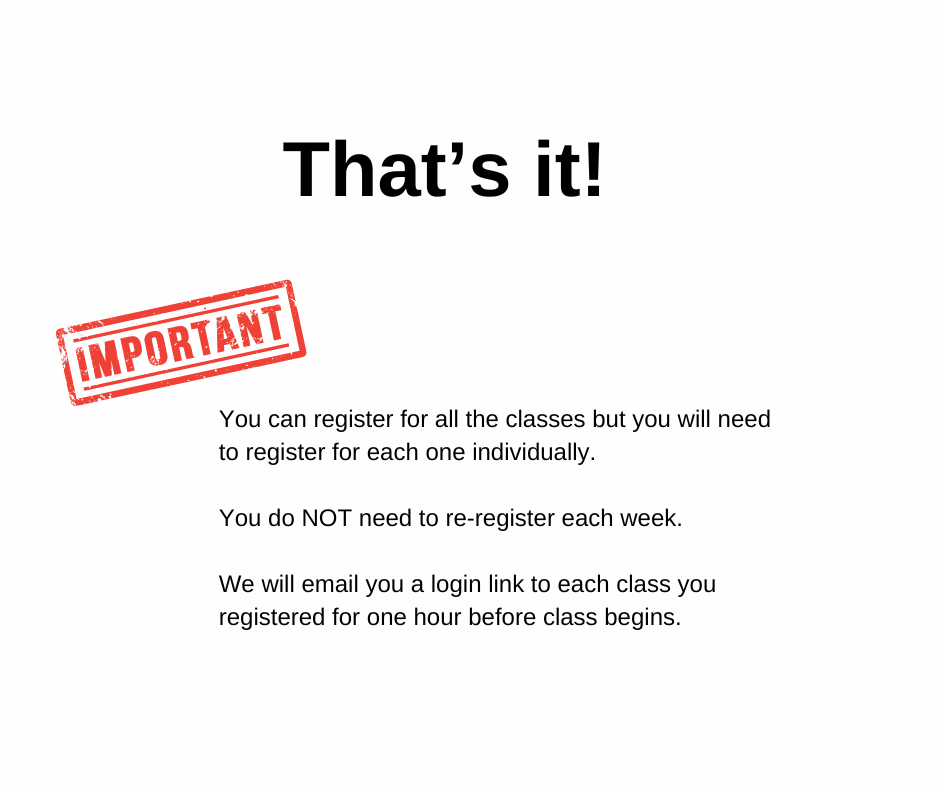 - NOTE: Please allow up to one business day for your registration to process and for you to begin receiving class links.