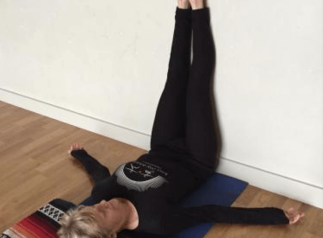 Set up near a wall/stacked pillows/blankets/other support. Carefully roll onto the back and extend the legs upward in a supported position. Extend the arms slightly away from the side body with palms up; or bent at the elbows with hands resting on the abdomen with palms down. Relax neck, arms, shoulders, and low back. Continue relaxing the legs on the support. Stay in the pose for as long as it is comfortable (approximately five to fifteen minutes).